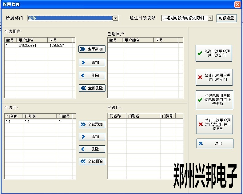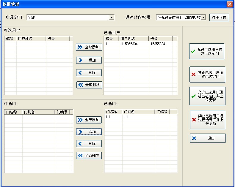 4、上傳完成后關閉窗口,在‘通過時間段權(quán)限’中選擇需要的時間段然后將用戶和控制器都添加進去,最后點擊‘允許已選用戶通過已選定門并上傳更新’上傳權(quán)限。如下圖所示
