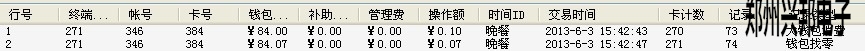 4.消費(fèi)卡第一次刷卡會(huì)扣掉一個(gè)費(fèi)率的錢,再次刷卡會(huì)找零,找零的記錄如下圖所示