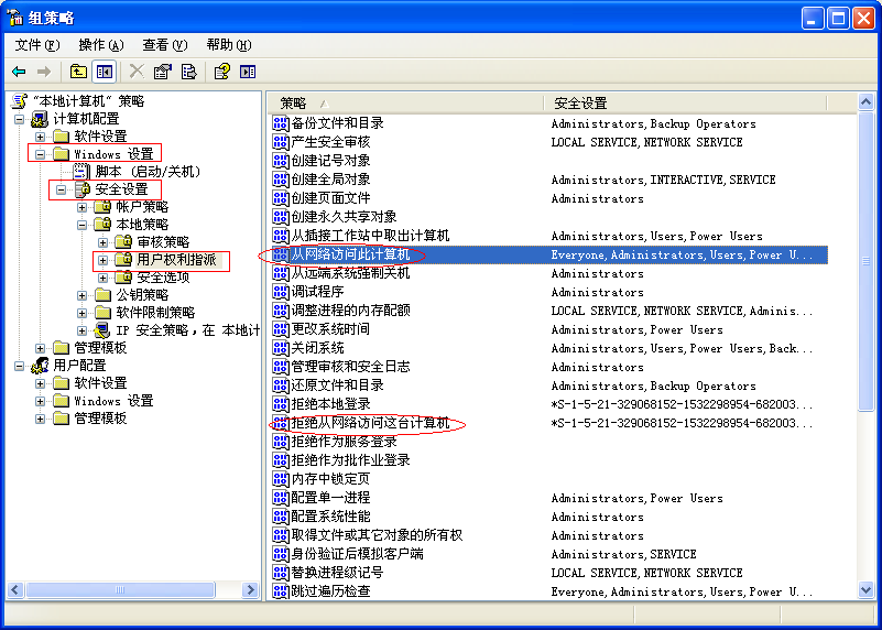 2.打開 組策略-計算機配置-windows設置-安全設置-本地策略-用戶權利指派中,將Guest賬戶添加到從網絡訪問計算機,拒絕從網絡訪問這臺計算機中將Guest賬戶刪除