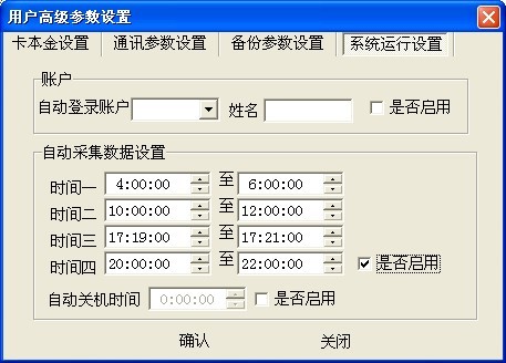 485一卡通軟件可以設(shè)置消費(fèi)數(shù)據(jù)定時(shí)采集,如下圖所示,在用戶高級(jí)參數(shù)設(shè)置-系統(tǒng)運(yùn)行設(shè)置中有一個(gè)自動(dòng)采集數(shù)據(jù)設(shè)置,最多可以設(shè)置四個(gè)自動(dòng)采集的時(shí)間段,時(shí)間段設(shè)置時(shí)不能跨天,且后一個(gè)時(shí)間段的開(kāi)始時(shí)間不能大于前一時(shí)間段的結(jié)束時(shí)間,設(shè)置完成后勾選上是否啟用,點(diǎn)擊確認(rèn)即可,如果沒(méi)有勾選上是否啟用,代表自動(dòng)采集數(shù)據(jù)設(shè)置不起作用。