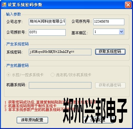 4) 系統密碼:跟卡的加密有關,單擊【設置密碼】出現圖5 輸入卡的加密參數(根據公司所提供的信息填寫),單擊【獲取系統密碼】,單擊【保存配置】。將獲取的密碼粘貼到系統密碼后面的空白處。再次打開該窗口時可以單擊【讀取原始密碼】,獲得卡的加密信息。