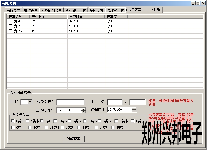 2、設置幾點到幾點之音流多長時間扣多少錢,在管理中心-系統設置-水控費率2、3、4設置里面設置時間,費率。