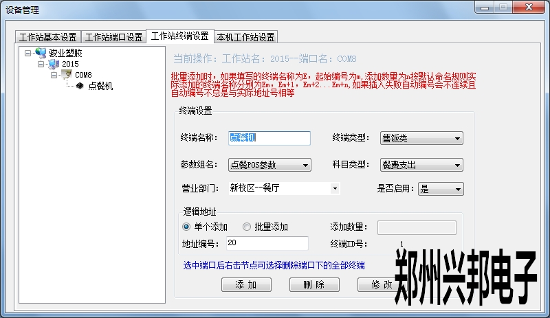 工作站終端設(shè)置:在端口地址下添加終端,進(jìn)行添加時(shí)填寫(xiě)終端名稱,選擇終端類型、參數(shù)組名、科目類型、營(yíng)業(yè)部門(mén),是否啟用選擇是,添加地址時(shí)可以選擇單個(gè)添加和批量添加。此地址編號(hào)要與機(jī)器的編號(hào)相同。進(jìn)行批量添加時(shí)填寫(xiě)添加數(shù)量、地址號(hào),點(diǎn)擊添加后就可以以地址號(hào)遞增的形式添加機(jī)器。選中終端可以進(jìn)行修改和刪除操作,選擇端口右擊可以刪除端口下的所有終端。