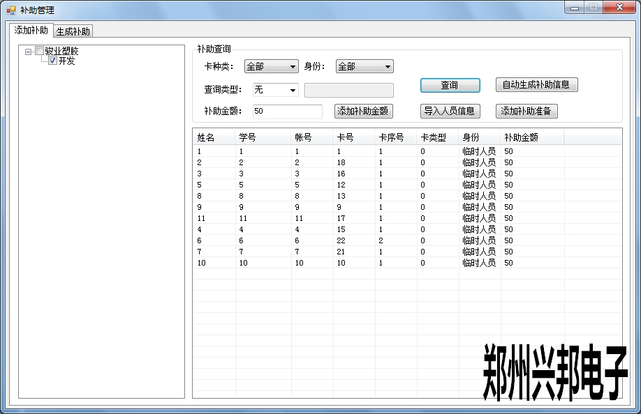 對于添加完成的補助,進行生成補助。對添加補助的信息可以按照卡種類,身份,部門,學號進行查詢選擇限定條件的人員進行補助,選中補助信息可以修改補助金額。選擇刪除后此補助計劃就沒有了。