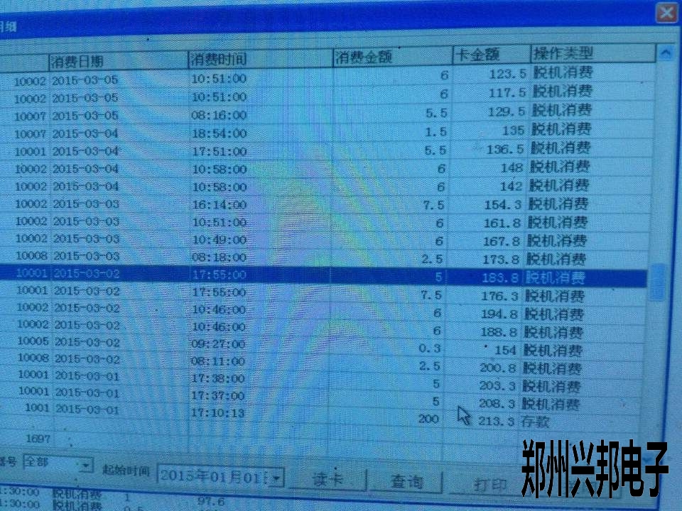讓客戶在軟件里面查看一下個人明細表,選擇這張卡從開卡到現在的時間段,從下往上看,因采集的時候只顯示到分,沒有顯示到秒,所以看數據的時候要在同一日期的往上看一下,有的是沒有按順序排列的。像圖上所示的,所選擇的這一列應該是比下面的這一列先消費的。還有一條是10005號的對不上,5號機應該是時間錯誤了,這條應該是3月3 號的消費數據。把5號機校一下時,下載一下參數就可以了。這種問題就解決了。