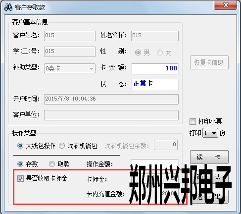 使用方法:首先要在制卡參數(shù)組中設(shè)置要收取的卡押金的金額,以元為單位,例如設(shè)置為20元。然后打卡存取款的界面,將需要充值的卡放到讀卡器上,點(diǎn)擊讀卡,會(huì)顯示出這張卡的信息,在操作金額一欄輸入要操作的金額,然后勾選是否收取卡押金,勾選后會(huì)自動(dòng)顯示出卡內(nèi)實(shí)際的充值金額,是操作金額減去押金后剩余的金額,然后點(diǎn)擊確認(rèn)即可。