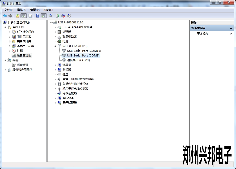單擊計算機—單擊右鍵—管理—設備管理—端口。找到所用usb線端口。如下圖: