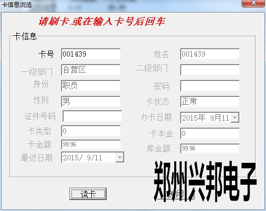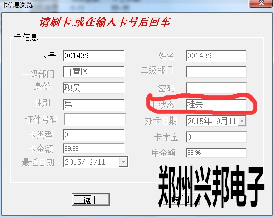 卡片就上面三種狀態,另外一些操作,會造成卡狀態改變,比如:掛失的卡解掛,就變成消費卡;掛失的卡補辦新卡,掛失卡就會變成新卡;消費卡被收繳舊卡就變成新卡。新卡在消費機上刷卡會顯示1-Err,消費卡會顯示金額,掛失卡會顯示4-Err