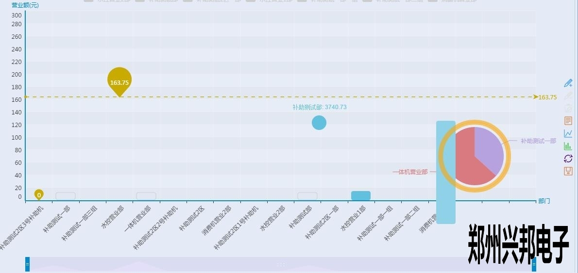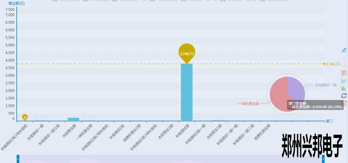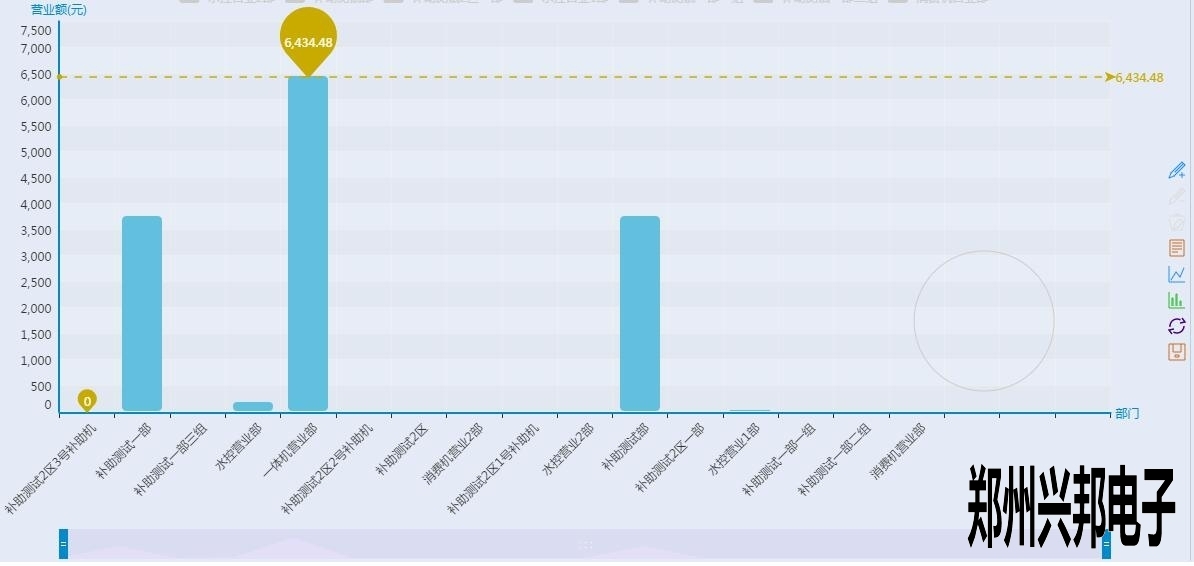 看上起跟終端營業圖表差不多,但是有沒有注意到有一根和終端營業分析圖不一樣樣色的虛線?這是這個圖表里面的最大值,也就是營業額最高的部門,當然下面的工具條也可以像終端營業分析圖一樣的滑動來看某個具體的柱圖,不過你又沒有注意到后面還有一個圈?對那是一個圈圈,有什么用呢?來看一下下面的圖形: