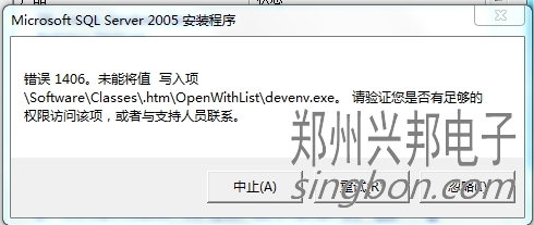 客戶使用我們的互聯網一卡通食堂售飯機,自己安裝SQL2005數據庫沒裝成功,讓我們遠程再重裝一次,在控制面板里卸載后并刪除之前的安裝文件,又重新安裝時提示:錯誤1406。未能將值 寫入項\Software\Classes\.htm\OpenWithList\devenv.exe。請驗證您是否有足夠的權限訪問該項,或者與支持人員聯系。這時該怎樣解決呢?