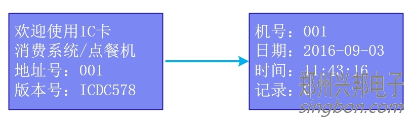 將消費(fèi)機(jī)插上12V電源,開(kāi)機(jī)時(shí)顯示版本號(hào)和機(jī)器號(hào),最后轉(zhuǎn)入待機(jī)界面,顯示機(jī)器號(hào)、日期、時(shí)間界面。
