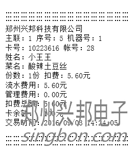 3) 自動(dòng)消費(fèi)模式:最多可設(shè)置8個(gè)費(fèi)率,每個(gè)費(fèi)率可設(shè)置對(duì)應(yīng)的菜肴、份數(shù),將費(fèi)率設(shè)置好之后在自動(dòng)模式下輸入相應(yīng)的費(fèi)率編號(hào)放卡即可自動(dòng)扣除相應(yīng)費(fèi)用。只有計(jì)算和自動(dòng)模式可以用,計(jì)算模式只作為查看使用,不能扣費(fèi)。若連接的有打印機(jī),可打印消費(fèi)明細(xì),打印出來(lái)的消費(fèi)明細(xì)格式如下圖所示: